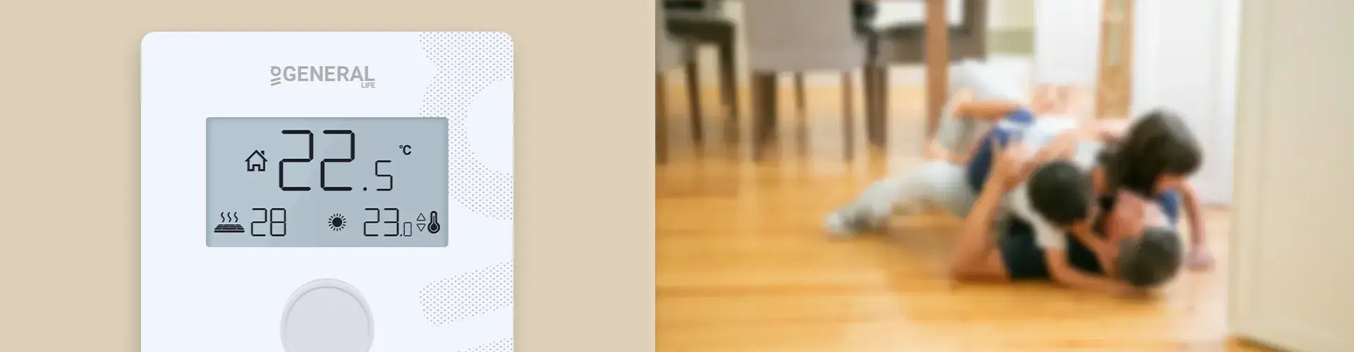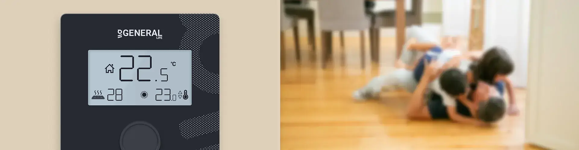 Если подключен дополнительный датчик пола, защита от перегрева будет активна при 28°C. Если датчик пола GENERAL Life покажет температуру на 1°C выше заданной, Комнатный Термостат выключит отопительный блок. Если покажет на 1°C ниже заданной температуры, Комнатный Термостат включит отопительный блок.