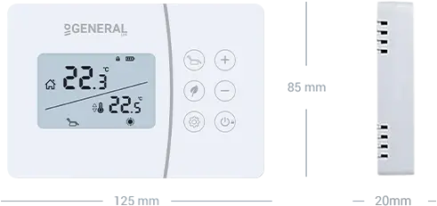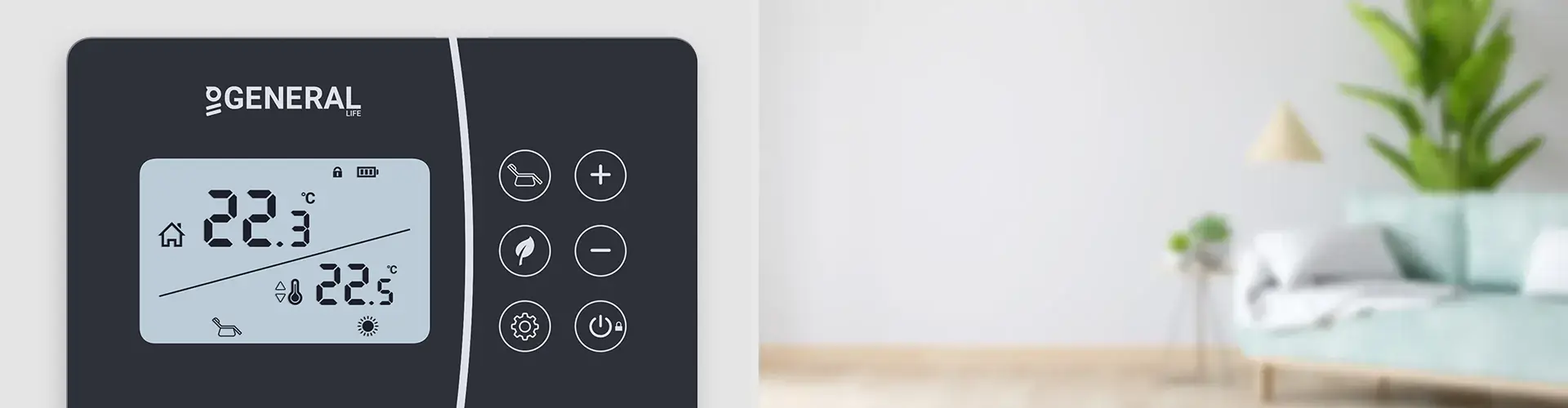 Wired room thermostat communicates with the heating unit via a cable. It is usually mounted on the wall. We recommend placing it in a central location where there is not much air circulation.