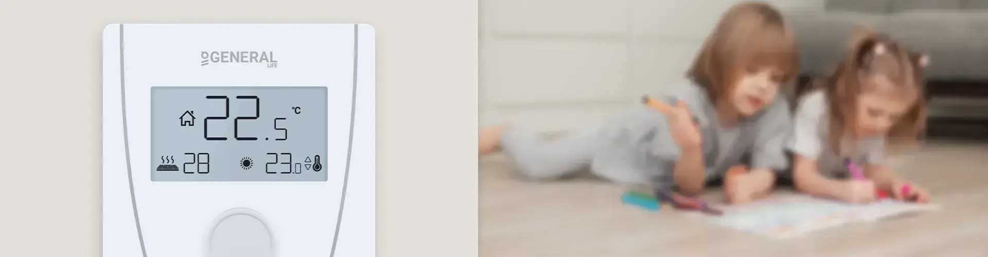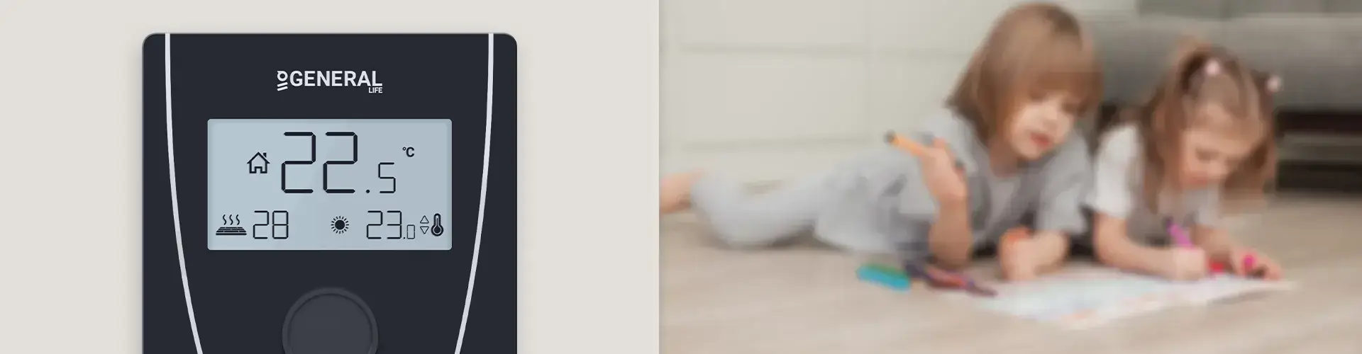 Если подключен дополнительный датчик пола, защита от перегрева будет активна при 28°C. Если датчик пола GENERAL Life покажет температуру на 1°C выше заданной, Комнатный Термостат выключит отопительный блок. Если покажет на 1°C ниже заданной температуры, Комнатный Термостат включит отопительный блок.