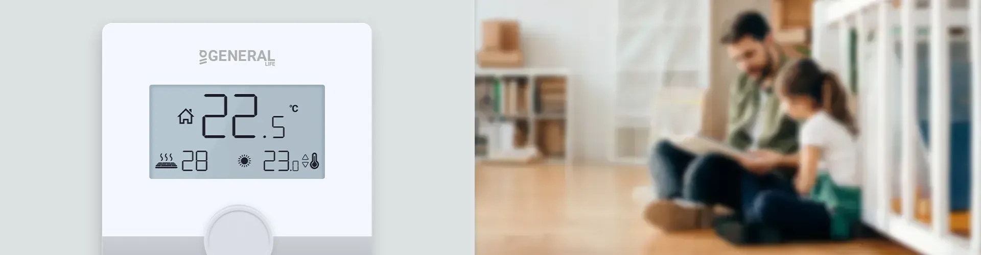 Если подключен дополнительный датчик пола, защита от перегрева будет активна при 28°C. Если датчик пола GENERAL Life покажет температуру на 1°C выше заданной, Комнатный Термостат выключит отопительный блок. Если покажет на 1°C ниже заданной температуры, Комнатный Термостат включит отопительный блок.