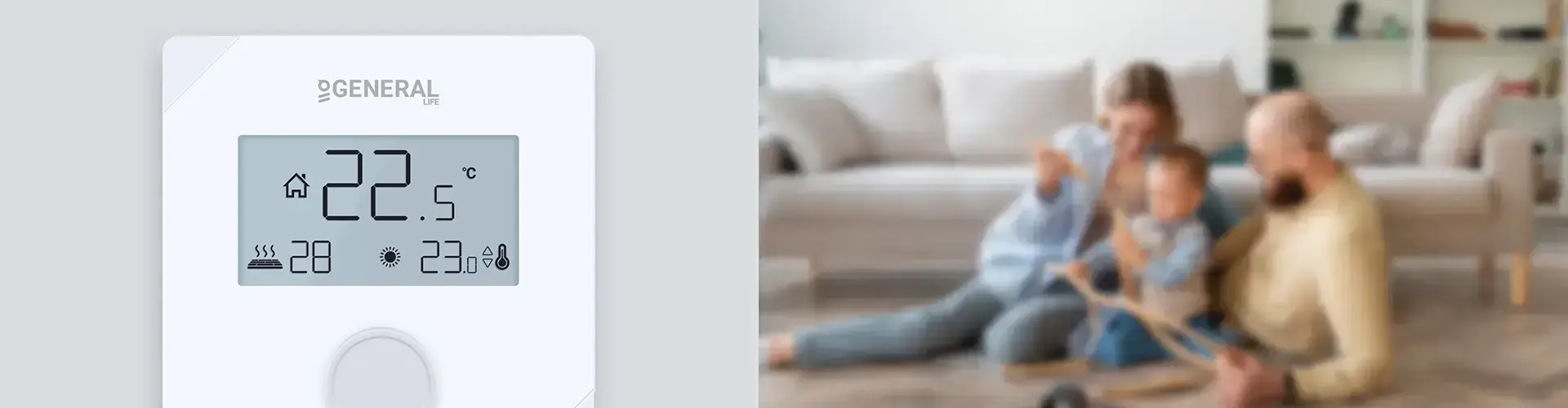 Если подключен дополнительный датчик пола, защита от перегрева будет активна при 28°C. Если датчик пола GENERAL Life покажет температуру на 1°C выше заданной, Комнатный Термостат выключит отопительный блок. Если покажет на 1°C ниже заданной температуры, Комнатный Термостат включит отопительный блок.